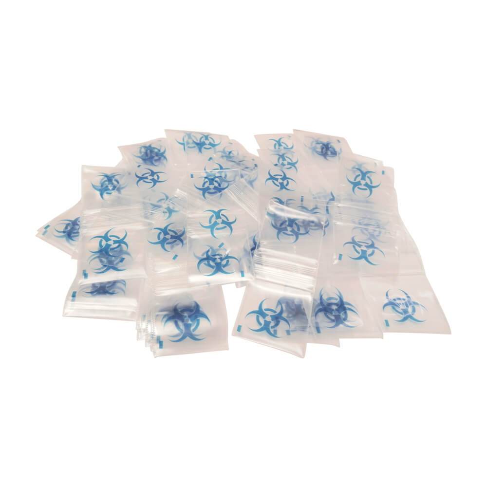The Biohazard symbol is usually used as a warning so that those potentially exposed to harmful substances will know to take precautionary measures. On these baggies it just looks kinda cool.